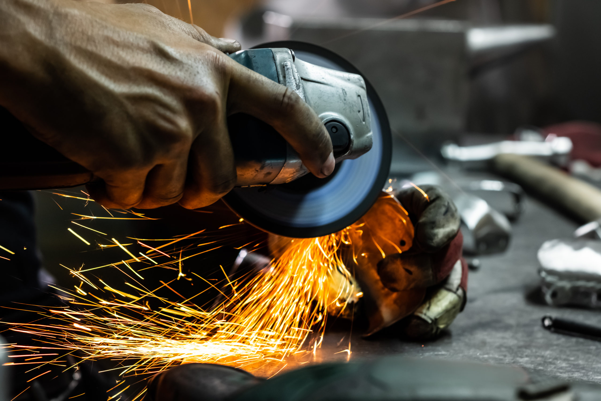 ディスクグラインダーやバンドソーで金属板を切断します。切断時は火花が出るので、防護具を必ず着用してください。(→関連:「金属板切断のきれいな仕上げ方(ディスクグラインダー)」) - ・ヤスリ・研磨